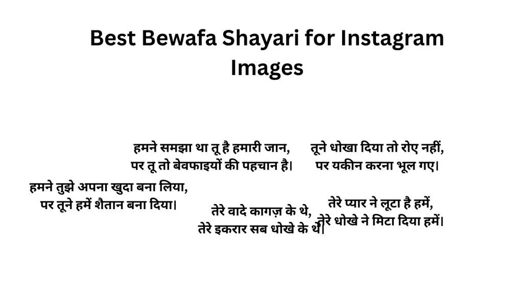बेवफा शायरी इमेज के लिए आपके posts, stories, और reels को viral बनाने का सबसे अच्छा तरीका है। यह collection उन लोगों के लिए है जिन्होंने प्यार में धोखा खाया है, जिनका भरोसा तोड़ा गया है। चाहे आप emotional शायरी story में लगाना चाहें, attitude वाली caption देना चाहें, या bio में status लगाना चाहें – यहाँ हर मूड के लिए bewafa shayari image मौजूद है।